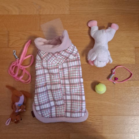 Koiran vaatepakkaus, johon kuuluu useita erimallisia ja -värisiä vaatteita pienelle koiralle. Mukana on harmaa huppari vaaleanpunaisilla yksityiskohdilla ja painatuksella, musta-kuviollinen neulemainen takki, harmaa-valkoinen talviaiheinen paita sekä pinkki paita tekstillä. N. 3-4kg koiralle.