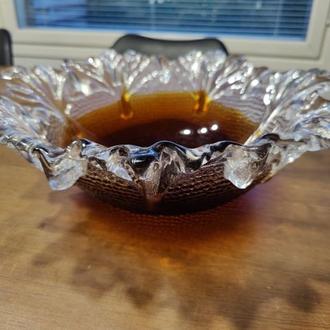 Humppilan lasin valmistama ja Kaija Aarikan suunnittelema Männynoksa -tarjoilulautanen. Halkaisija 24cm