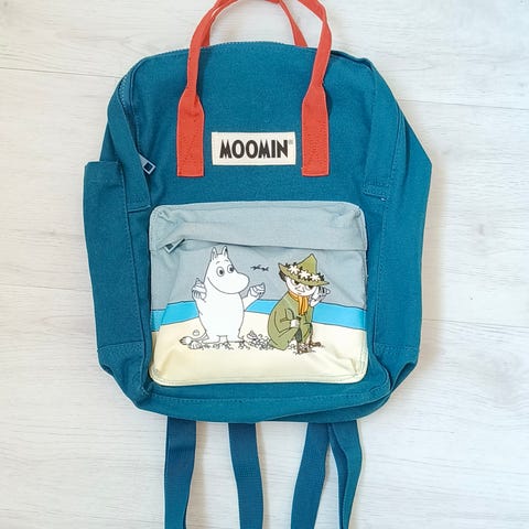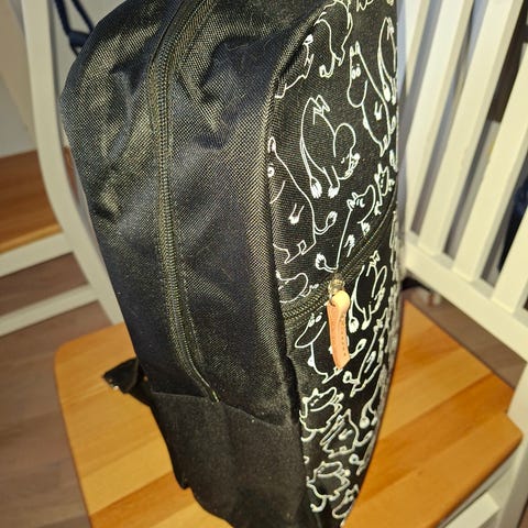 Myydään käyttämätön muumi reppu. Yksi vetoketjullinen tasku edessä. Pehmustetut olkaimet. Musta.