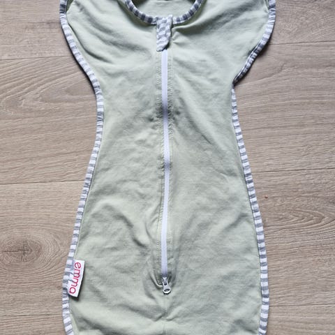 Vaaleanharmaa Emman kapalopussi koossa M (4-6 kk, 5.5-8 kg). Tuplavetoketju. Hihoissa nepparit, joten hihat on helppo kääntää auki, kun vauva oppii kääntymään. Kangas on vielä napakka, käsiosissa hieman nukkuu (kuvat).