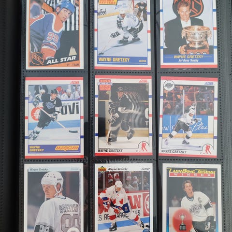 Tässä kortteja kovilta nimiltä. Gretzkyä monta sivua. Myös mm. Lemieux, Trevor Kidd, Chris Helios yms. Pelkkiä kovia nimiä.
