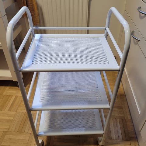 Kolmikerroksinen metallinen hylly pyörillä, täydellisessä kunnossa