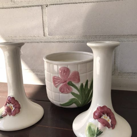 Vanha, hyväkuntoinen kukkamaljakko ja toisin päin kynttilä/tuikkuastia. Koko korkeus n. 15 cm. Kukkamaljakon suuosassa lasitus vähän kärsinyt(ei mitään halkeamia/lohkeamia ), kun on pidetty sitä puolta jalkana tuikkuastialle eli ollut pöytää vasten. Kauniit värit. Koriste-esine, savityö, keramiikkaa