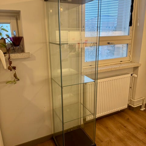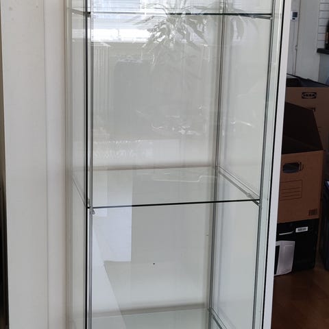 Ostetaan kuvan kaltainen Ikean jo mallistosta poistunut ( hankittu 2010-luvulla) valkoinen lasivitriini, lasikaappi.