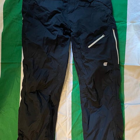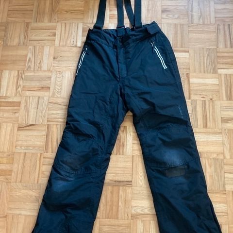 Mustat toppahousut, todella hyvä kunto, koko 164. Sivutaskut, heijastin, lumilukot. Vyötärö säädettävä tarravyö.
