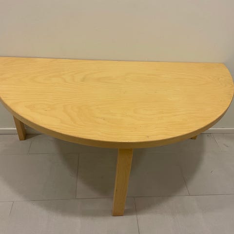 Artekin puolipyöreä lastenpöytä punainen linoleum. Pöytä on vanha talttapää ruuveilla ja siinä on kulumaa.