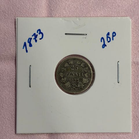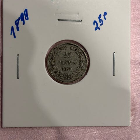 Suomen 25p hopeakolikko vuodelta 1906. Kolikko on metallia ja säilytyskotelossa. Sopii esimerkiksi kokoelmakäyttöön tai numismatiikan harrastajalle historialliseksi rahakohteeksi.