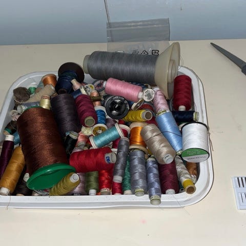 Monenlaista kangasta ja ompelutarviketta. Oikeanpuolimmaisia leikattu, joten reunat eivät ole suoria. Mutta ihan mukavan kokoiset, voin mittailla tarkemmin ostajan niin halutessa. Kaikki yhteensä 10 euroa.