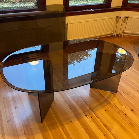 Myydään ovaalinmallinen lasipöytä messinkijaloilla. Pöytä on täysin ehjä ja uuden veroisessa kunnossa eikä pöydässä ole kolhuja tai naarmuja missään. Savuton kotitalous, ei lemmikkejä. Vain nouto.