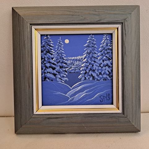 Maisemataulu, jossa on vuoristomaisema, silta ja vedenpinta heijastuksineen. Kuvassa näkyy vuoria, puustoa ja pitkä puusilta tai kävelytie, joka kulkee veden yli. Taulu sopii sisustuselementiksi esimerkiksi olohuoneeseen. 30 x 40