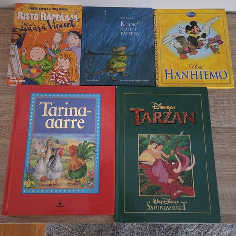 Erä kovakantisia lastenkirjoja, yhteensä 5 kirjaa. Kirjat ovat värikuvitettuja satukirjoja, joissa on tarinoita eläinhahmoista ja seikkailuista sekä yksi Disney-aiheinen kirja. Sopivat ääneenluettaviksi tai itse luettaviksi lapsille. Myydään yhtenä pakettina.
