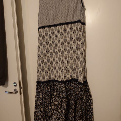 Vähän käytetty maximekko - vyöllä tai ilman. Vaalealla pohjalla oransseja ja pinkkejä kuvioita. Kaula-aukossa ja hihansuissa yksityiskohtana röyhelö. Mittoja: kai-kai 55cm, olka-helma 125cm, vyötärö 50cm.