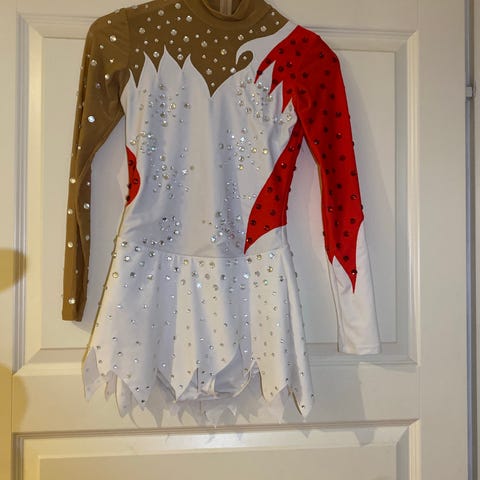 Violetti taitoluistelumekko kauniilla yksityiskohdilla. Mekossa tulee mukana body joka on samankokoinen kuin mekko. Mekon hihat ovat vähän purkautuneet mutta huomaamaton kaukaa. Mekko ostettu käytettynä vuonna 2022 noin 85 eurolla. Tinkivaraa on!