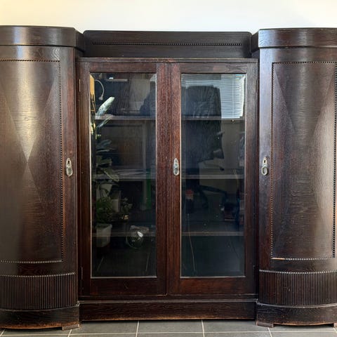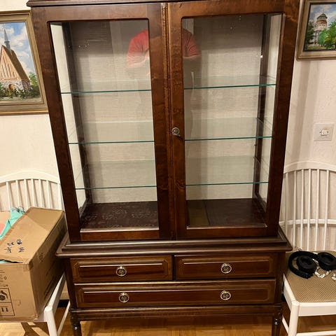 Vitriinikaappi lasiovella ja laatikoilla tummanruskea puu