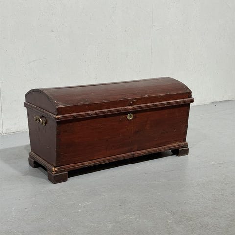 Hakusanat: vintage, arkku, säilytysarkku, rustiikki, talonpoikaistyyli, vintage huonekalut, kantokahvat, pehmustettu kansi, metallilukot