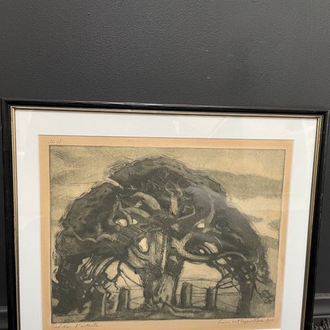 Kehyksessä on kulumaa ja lasissa saattaa olla pieniä naarmuja. Paperi on kellastunut ajan myötä, mikä on tyypillistä vanhoille teoksille.