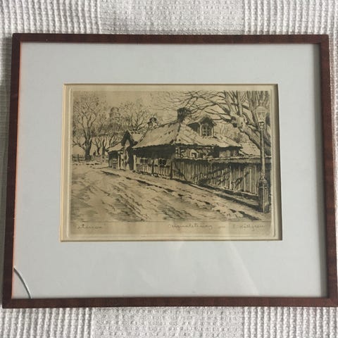"Petissan" etsaus, joka on kehystetty koristeelliseen kehykseen. Teos esittää talvista katunäkymää, jossa on vanhoja rakennuksia ja paljaita puita. Alareunassa on signeeraus ja merkintä 'Original etsning av E. Hällgren'.