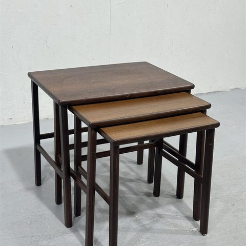 Kolme sisäkkäin menevää pöytää, joissa on kaarevat jalat ja ruskea pinta. Pöydät ovat eri kokoisia ja ne voidaan asettaa sisäkkäin tilan säästämiseksi.