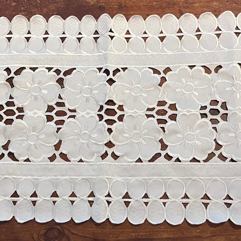 Valkoinen pöytäliina 112 x 112 cm hillityllä kuviolla.