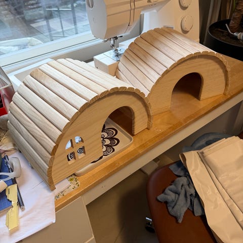 Kääpiöhamsterilla käytössä olleet keraaminen omena ja kookoksen puolikas. Omenan korkeus noin 10 cm.