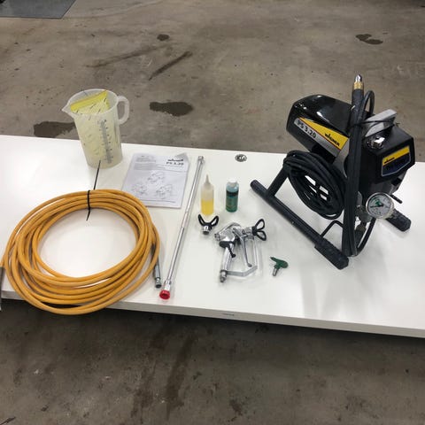 linjamaalauskone bensiinimoottorilla. Laite on pyörillä liikuteltava maalauslaite, jossa on polttomoottori ja korkeapaineruisku tien- ja pysäköintialueiden linjamaalaukseen. Koneessa on maaliletku ja ruiskupistooli sekä maalisäiliö. Soveltuu esimerkiksi piha- ja pysäköintialueiden, teiden sekä muiden kovien pintojen linjojen ja merkintöjen maalaamiseen.