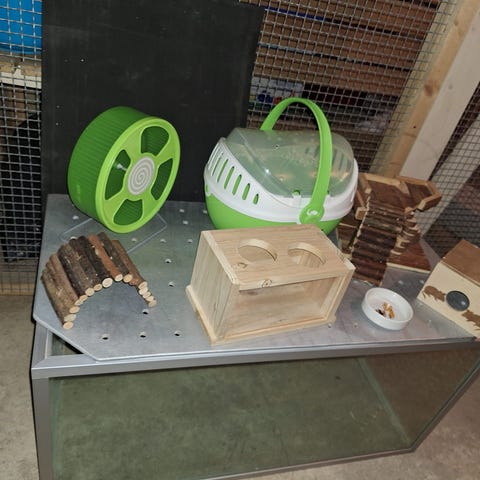 Muovinen pieneläinhäkki, jossa sininen pohjalaatikko ja läpinäkyvä yläosa metalliritilällä. Häkki soveltuu esimerkiksi hamsterille tai muille pienille jyrsijöille. Mukana juomapullo, juoksupyörä, ruokakuppi, kiipeily- tai leikkivälineitä sekä pieni puinen maja. Häkissä on ylhäältä avattava ritilä, joka helpottaa eläimen hoitoa ja tarvikkeiden asettelua. Todella hyvässä kunnossa, kerran käytetty. Mitat on: korkeus 32cm pituus 46cm ja leveys 72cm. Mukana saa hamsterin ruokia.