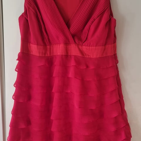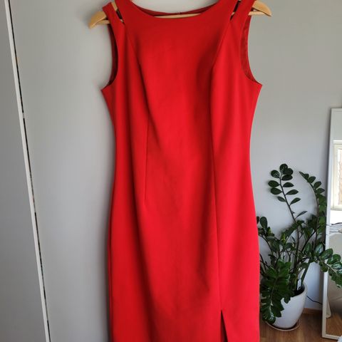 Naisten punainen mekko, koko 38. Mekko on pitkä ja suoramallinen, helmassa halkiot sivuilla. Lämmin musta pikkutakki koko 40 käy hyvin mekon kanssa. Sopii arki- ja juhlakäyttöön erilaisten asusteiden kanssa yhdisteltäväksi.