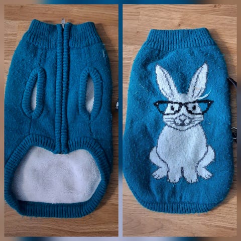 Koiran neuleliivi ruutukuviolla. Väri on harmaa-valkoinen. Liivissä on etujalkojen aukot ja vetoketju mahapuolella. Selässä aukko valjaiden kiinnitystä varten. Meidän koiralle liian leveä, joten etujalat on koko ajan takin sisällä jumissa, eikä kävelystä tule mitään, vaikka söpöltä näyttääkin takki päällä. Pari kertaa käytetty.