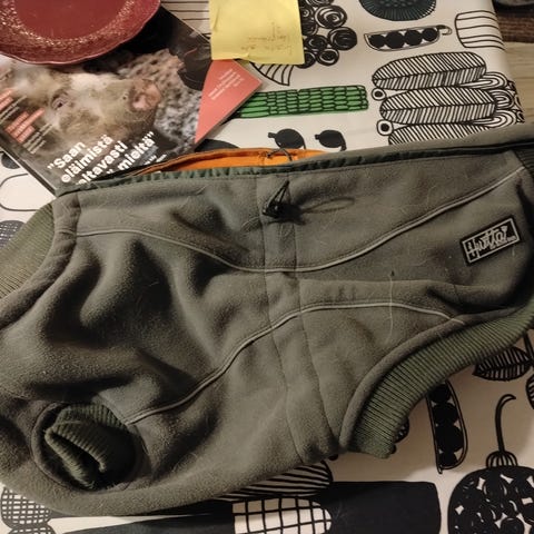 Hurtta koiran takki, koko 40. Musta / tummanharmaa. Takissa pehmeä, lämmin vuori, pääaukossa harmaa karva. Kiinnitys selästä klipsulla. Kaulassa säätönyöri. Selässä aukko valjaiden kiinnittämistä varten. Meidän koiralle rinnasta liian leveä, joten jalat menee helposti jumiin rintaläpän alle.