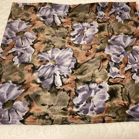 2.) tummapohjainen kukka-, ym kuviokangas. Pituus 190 cm, leveys 140 cm, vielä raskaampaa kuin edellinen, hyvin laskeutuvaa. Hp 7 €