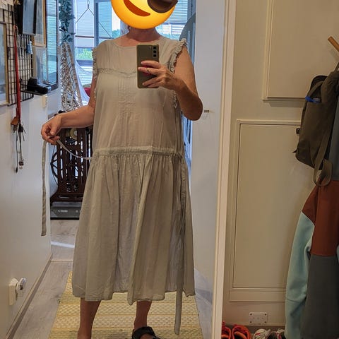 Luonnonvalkoinen puuvillamekko, kauniit laskokset ja kirjailtu helma.