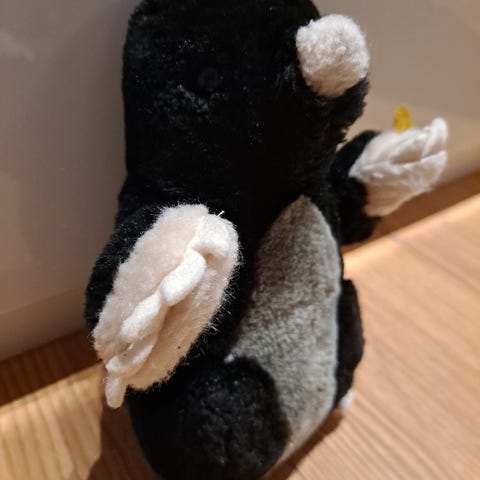 Steiff pehmokissa, raidallinen turkki ja vaalea kuono. Valmistettu Saksassa, korvassa metallinappi ja keltainen Steiff-merkintä “Knopf im Ohr”. Kissan nenässä kulumaa.