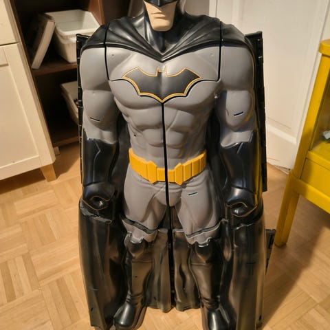 Batmanin monitasoinen leikkilinna harmaasta muovista. Useita tasoja, ovia ja kulkuaukkoja sekä Batman-logo keskiosassa, jossa valotoiminto. Rakennelmassa on sinisiä, violetteja ja mustia yksityiskohtia sekä liikuteltavia osia, kuten ovia ja hissejä. Osa osista irronnut ja/tai vaihdettu itsetehdyillä. Liikkuvat osat toimivat, mutta osa jäykkiä. Ollut mukana mitä monenlaisimmissa leikeissä, milloin parkkihallina, milloin ritarinlinnana tai poliisin vankilana. Hieman on pölyä kertynyt, joten kaipaa pientä putsausta. Koko: 63x39x17cm