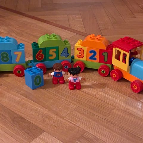 Lego Duplo City numeropalikat ja junarakennussarja. Setissä on erivärisiä Duplo-palikoita, joissa on numerot 1–10, sekä pyörillä varustettuja vaunuja. Mukana on myös Duplo-hahmo ja koirafiguuri. Sopii pienten lasten leikkeihin ja numeroiden harjoitteluun. Vain nouto.