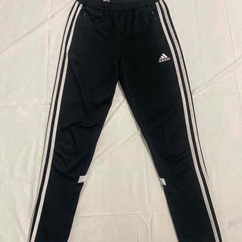 Adidas housut koko 152. Väri musta valkoisilla raidoilla sivuissa. Housuissa kapea lahjemalli ja joustava vyötärö kiristysmahdollisuudella. Sopivat jalkapalloon ja muuhun urheiluun tai vapaa-aikaan.