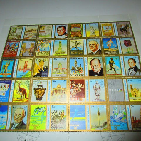 Pieni Olympia aiheinen postimerkkikansio 1970. Ensimmäisellä sivulla muutama Olympia postimerkki. Kahdeksan lehteä ja 16 sivua.