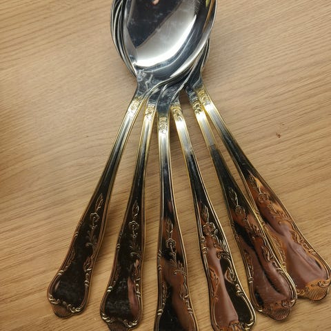 Vähällä käytöllä olleet kullatut salaattiottimet, ei ole kiillotettu pesun jälkeen.