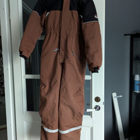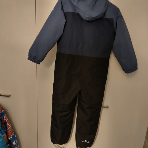 Lämmin, tukevasta kankaasta suunniteltu tummansininen toppahaalari. Hupussa irroitettava karvareunus.