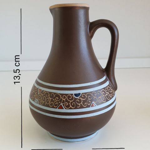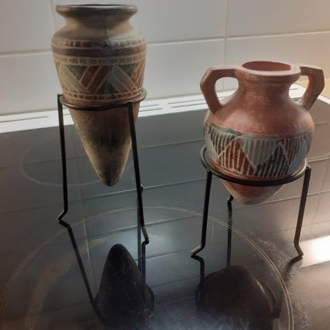 Käsin maalatut saviruukut. Korkeus 19 cm ja 17 cm. Toisessa koristenauha. Ostettavissa myös erikseen 15 e/kpl.