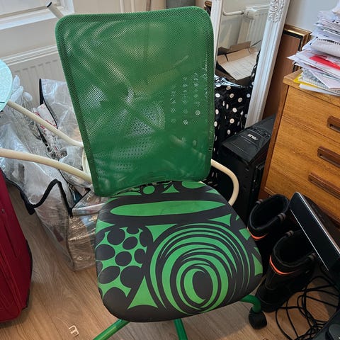 Annetaan Arozzi pelituoli. Selkänojan ulkopuoli koiran raapima. Istuinosassa ja selkänojassa muutenkin reilua kulumaa. Tuolin mekanismit kuitenkin täysin toimivat ja käsinojat hyvässä kunnossa. Jos sattuu olemaan jollekkin tarvetta varaosiksi niin saa noutaa ilmaiseksi.