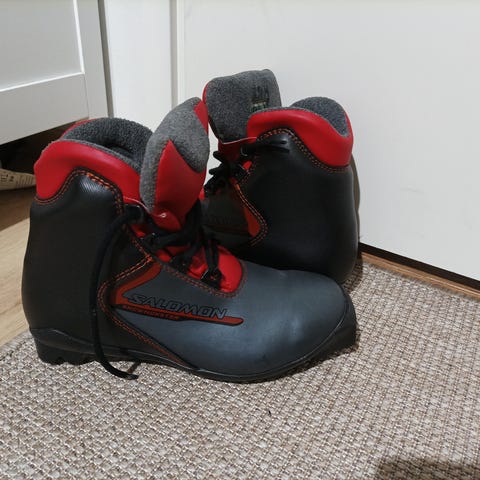 Salomon hiihtomonot, koko EUR 35 (UK 2,5, US 3, jalan pituus noin 21,5 cm). Väri musta, sivuilla monivärinen Salomon-logo. Pohjassa karkea kuvio, joka on tarkoitettu maastohiihtoon. Monot sopivat esimerkiksi lasten tai nuorten maastohiihtoon, yhteensopivuus Salomon-siteiden kanssa (SNS-tyyppinen pohja kuvan perusteella).