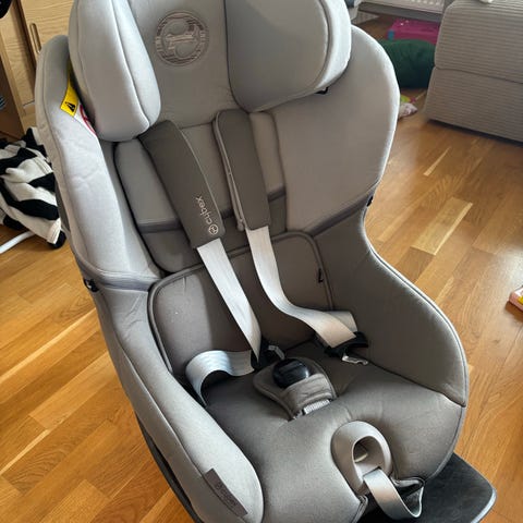 Cybex Sirona Plus turvaistuin 18 kg, harmaa. Turvaistuin on tarkoitettu lapsille noin 18 kg asti. Istuimessa on viisipistevaljaat ja pehmustetut olkavyöt. Selkä menosuuntaan -asento sekä kasvot menosuuntaan -asento ovat mahdollisia valmistajan ohjeiden mukaan. Istuimessa on säädettävä selkänoja ja pääntuki lapsen koon mukaan. Kuvissa näkyy isofix-telakka, johon istuin kiinnitetään auton isofix-kiinnikkeisiin. Verhoilu on pehmustettu ja irrotettavissa pesua varten valmistajan ohjeiden mukaisesti. Harmaa kangas ja vaaleat valjaat näkyvät kuvissa. Istuin on siisti.