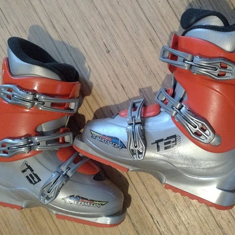 Salomon laskettelumonot, pohjan pituus 295 mm ja kokomerkintä 22/22,5. Väri valko-harmaa punaisilla yksityiskohdilla. Monossa useita metallisia solkia ja hihna varmistamassa istuvuuden. Soveltuvat alppihiihtoon yhteensopivien alppisiteiden kanssa. Koko ja mitat näkyvät kuvissa pohjasta ja sivusta.