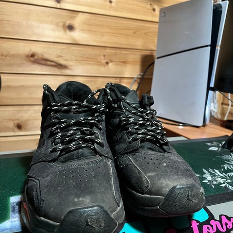 Jordan tennarit, koko 42. Väri valkoinen sinisillä ja harmailla yksityiskohdilla. Päällinen näyttää olevan synteettistä tai nahkajäljitelmää, jossa on kuvioidut vahvikkeet. Nauhakiinnitys edessä ja kumipohja, jossa Jordan-logo pohjassa ja kantapäässä. Soveltuvat arkikäyttöön ja vapaa-aikaan.