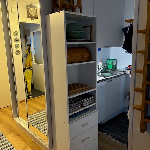 Sisältää 2-tasoisen ohuen hyllyn, leveän hyllyn, talouspaperitelineen, 4 lyhyttä seinätankoa ja 2 pitkää seinätankoa, joihin mukana tulevat hyllyt voidaan kiinnittää tai joihin mukit tai muut esineet voidaan ripustaa S-koukkujen avulla.