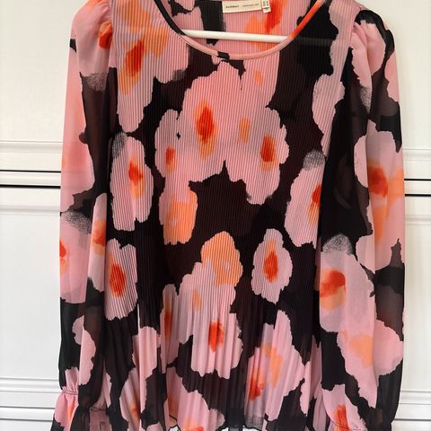 InWear kuviollinen paita/tunika, musta–harmaa–beige sävyissä. Kevyt ja joustava kangas, kauluksellinen malli ja nappikiinnitys edessä. Takaa hieman pidempi. Over size -malli, väljä istuvuus. Kunto hyvä.