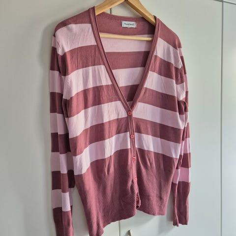Pierre Cavallo musta neuletakki, kevyttä ja osin läpikuultavaa neulosta. V-pääntie ja napit vain rinnuksen kohdalla, muuten avonainen malli. Vyötäröllä solmittava nauha sekä koristeelliset neuleyksityiskohdat. Hihansuissa ja helmassa kevyesti aaltoileva reuna. Huom! Vastaa mielestäni enemmän kokoa L–XL, mutta kokolapussa lukee XXL. Kunto hyvä.