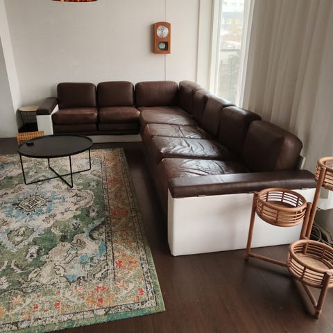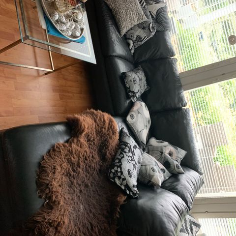 Pohjanmaan Kalusteen mittatilaustyönä tehty nahkasohva (3500€) + Iskun nojatuoli ja rahi. Sohvaa on paikattu papukaijan jäljiltä.