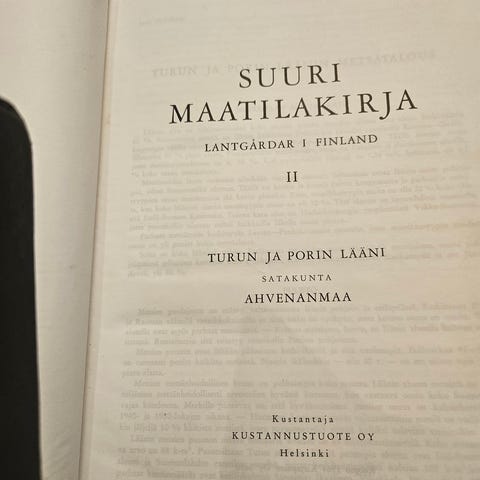 Myydään Suuri maatilakirja II – Turun ja Porin lääni: Satakunta ja Ahvenanmaa. Laaja maatila- ja paikallishistoriallinen hakuteos, joka käsittelee Satakunnan ja Ahvenanmaan pitäjien maatiloja. Sisältää runsaasti tietoa tiloista, omistajista ja paikallishistoriasta.
