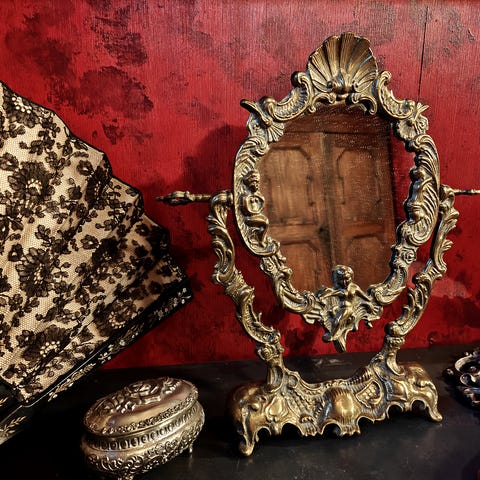 Muuta: Tämä runsas ja koristeellinen pöytäpeili edustaa rokokoon ja viktoriaanisen kauden muotokieltä, jossa lehtikuviot, voluutit ja simpukankuoret yhdistyvät kerubihahmoihin (putti). Peilin soikea muoto ja kallistettava rakenne viittaavat ns. psyke-peileihin ((psyche mirrors), joita käytettiin pesupöytien ja buduaarien yhteydessä jo 1600-luvulta lähtien. Tällaiset peilit olivat varakkuuden ja hienostuneen maun symboleja, ja niiden runsas koristelu heijasti aikakauden ihanteita: jumalallista kauneutta, suojelusta ja romanttista estetiikkaa.
